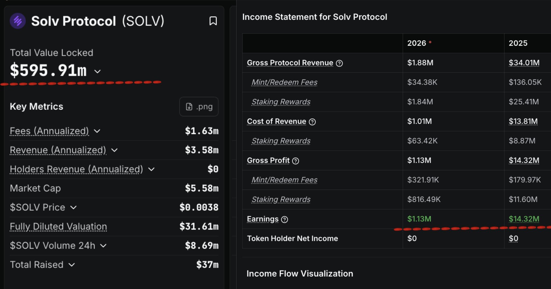 marilyn100x.eth DeFi_Expert Educator A10.16K @marilyn100xTurns out, @SolvProtocol is one of the most mispriced assets in BTCFi right now. > $7M market cap (~18M FDV) > $550M TVL. > $16.9M in gross profit (2025: $14.2M, 2026 already: $1.4M) > More than 2x profit vs Mcap with a MCap/TVL ratio of ~1.2%. $Solv is the #2 Bitcoin LST by TVL. The market is pricing it like it's dying. The on-chain data says otherwise.