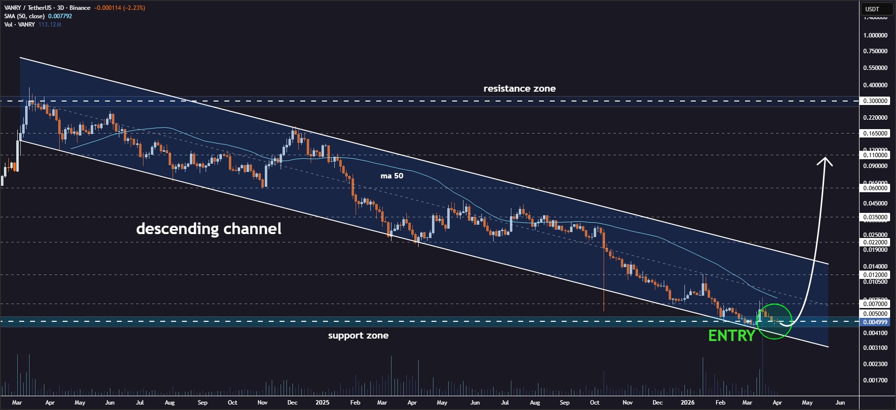 - SummaryVANRY finds support at the lower boundary of the 3‑day downtrend channel, price up 5.7%, showing a rebound signal.