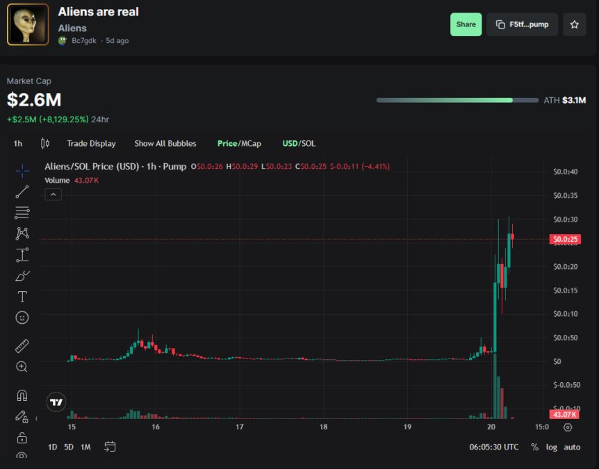 Meme coin 'Aliens Are Real' surged 100x after Trump's UFO remarks, market cap reaching $2.6M.