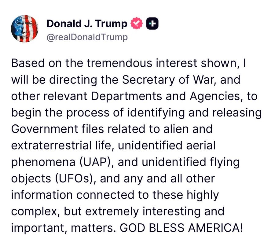 🚨UPDATE: A 5-day-old meme coin “Aliens Are Real” surged 100X after Trump teased the release of government UFO and alien files.
