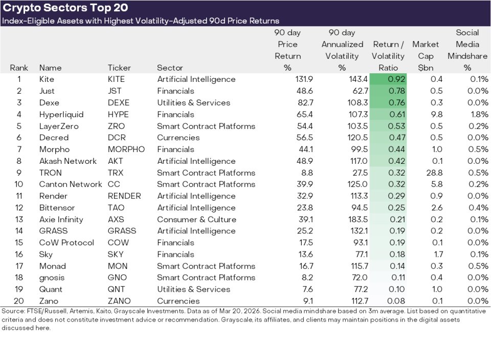 🆕 Crypto Sectors Top 20 from Grayscale Research highlights the top index-eligible tokens from Q1 '26 based on volatility-adjusted returns.