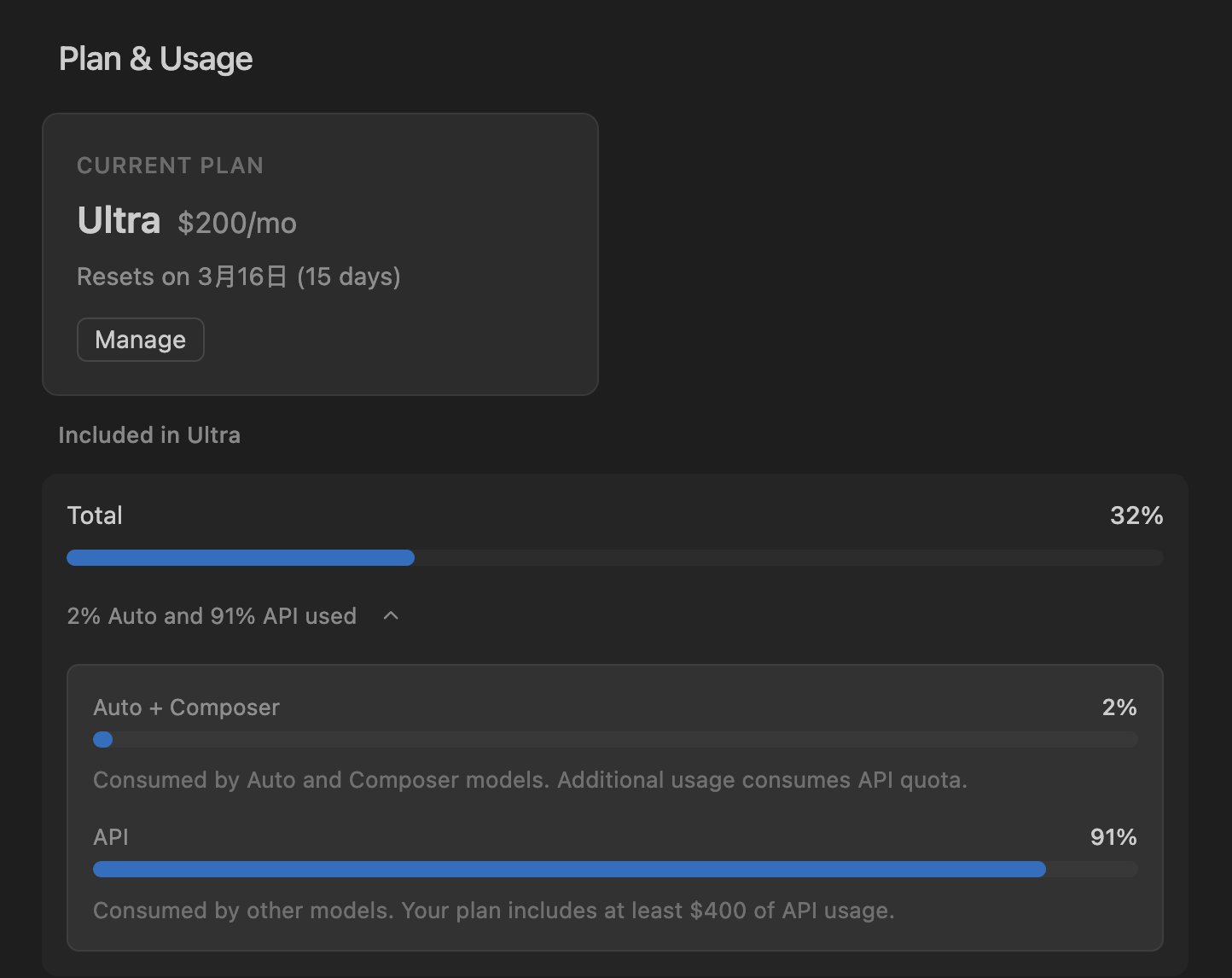 I bought the 200u/month Ultra plan, and just one vibe RBTC project already used 50% of the API quota. Cursor’s own large model is underpowered and can’t replace Opus 4.6/GPT 5.3.