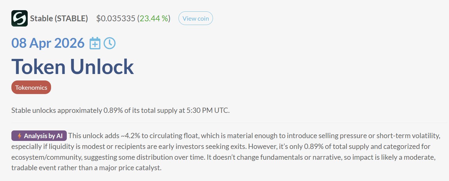 STABLE token unlock may bring short-term selling pressure, but has little impact on fundamentals.