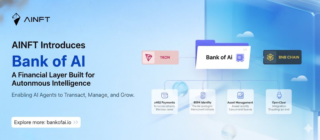 Hồng Ngọc | Ruby💎 DeFi_Expert Influencer B18.01K @hongngo38104169🚀 AINFT Introduces Bank of AI — A Financial Layer Built for Autonomous Intelligence The evolution of AI agents requires more than intelligence — it demands financial infrastructure that enables them to operate, transact, and manage assets independently. Bank of AI, introduced by AINFT, delivers exactly that: a programmable financial layer designed for AI‑driven economies. Launching first on TRON and BNB Chain, the system is built to expand across multiple blockchains, enabling seamless cross‑chain AI finance. 1️⃣ Complete x402 Standard Support ➜ Enables native payment execution for AI agents ➜ Allows autonomous services to charge and settle on‑chain ➜ Creates a programmable revenue model for machine‑to‑machine economies 2️⃣ On‑Chain Identity (Built on the 8004 Standard) ➜ Provides verifiable identity for AI agents ➜ Enables trust, accountability, and reputation systems ➜ Supports permissioned access and secure interactions 3️⃣ On‑Chain Asset Management ➜ AI agents can hold, allocate, and rebalance assets ➜ Supports treasury logic and automated capital strategies ➜ Enables real‑time financial decision‑making 4️⃣ Drop‑in OpenClaw Integration ➜ Simplifies integration with existing AI frameworks ➜ Enables rapid deployment for developers and protocols ➜ Accelerates adoption across Web3 ecosystems ✨ Why It Matters Bank of AI is more than a payment layer — it is banking infrastructure for autonomous intelligence, allowing AI agents to: ➜ transact independently ➜ manage capital ➜ build economic relationships ➜ operate across decentralized networks This marks another major step forward in advancing the #TRONAISeason and the future of AI‑powered on‑chain economies. 🔗 Explore more: https://t.co/l5pnXqDd09 Read more 👇👇👇👇 @justinsuntron @OfficialAINFT #TRONEcoStar