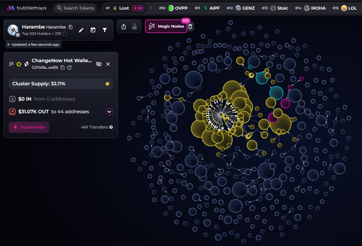 The Harambe token is heavily held by wallets associated with Change Now, posing a potential sell‑off risk leading to a crash.
