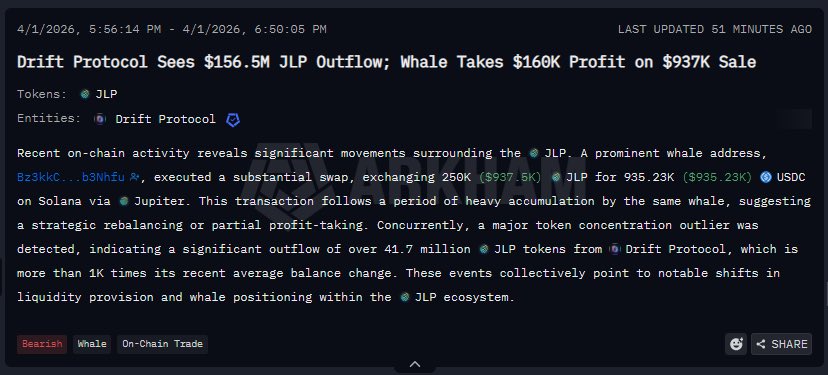 Drift Protocol's whale sell-off leads to $156.5 million JLP outflow, market bearish, tweet questions trade legality.