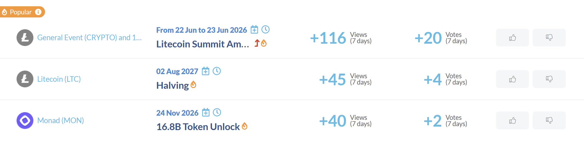 CoinMarketCal lists the LTC halving, summit, and MON token unlock as the hottest events recently.