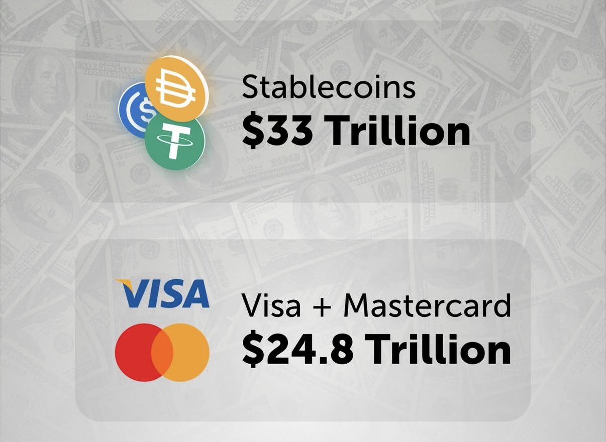 The stablecoin payment volume is projected to reach $33 trillion by 2025, surpassing Visa and Mastercard.