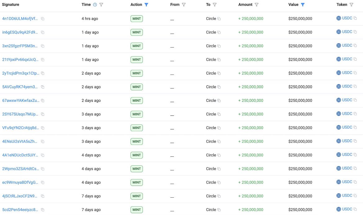 Circle(@circle) minted another 250M $USDC 4 hours ago.