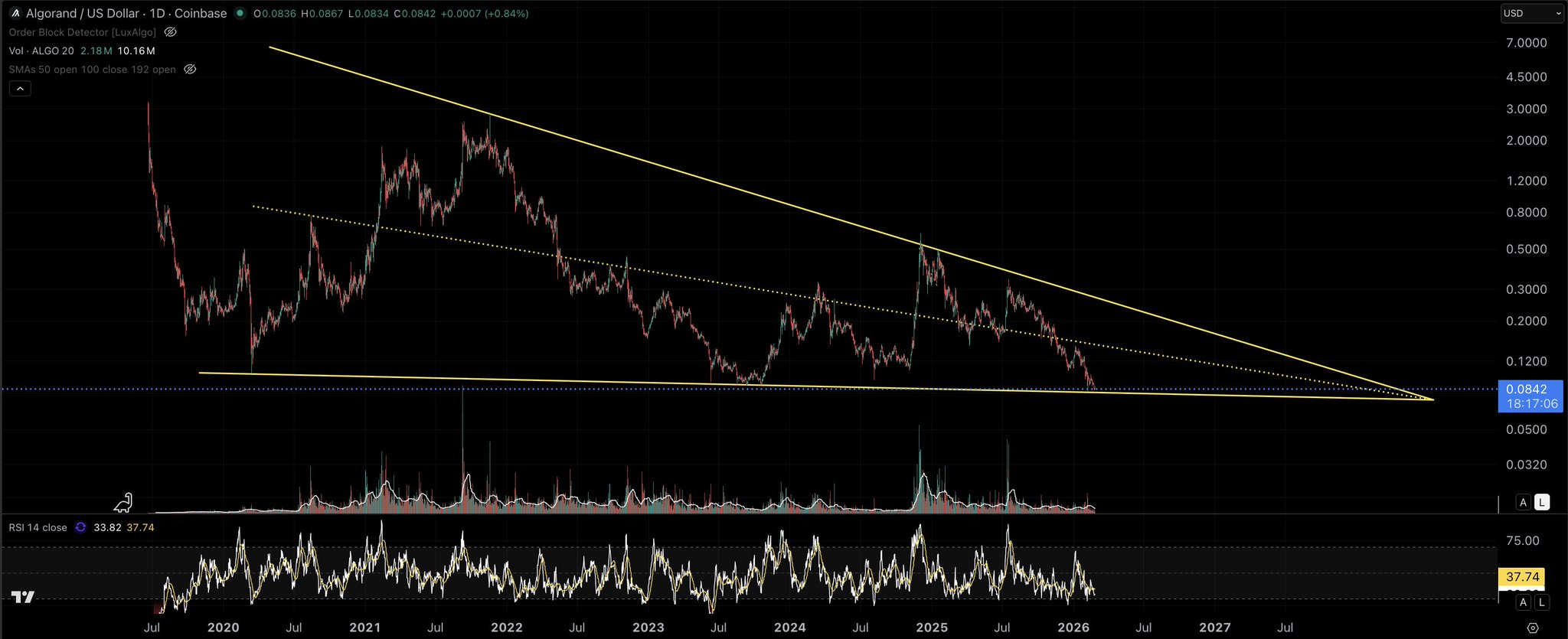#ALGO is now late-stage in its falling wedge, appx. 70 to 90% into the apex.