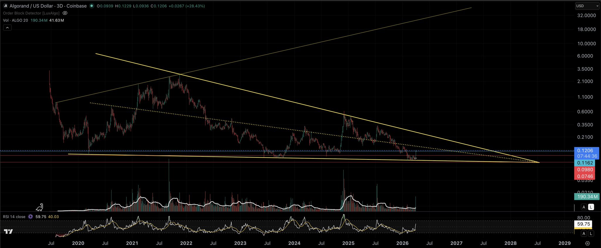 ALGO is in the late stage of a descending wedge, and the author expects an imminent upward breakout.