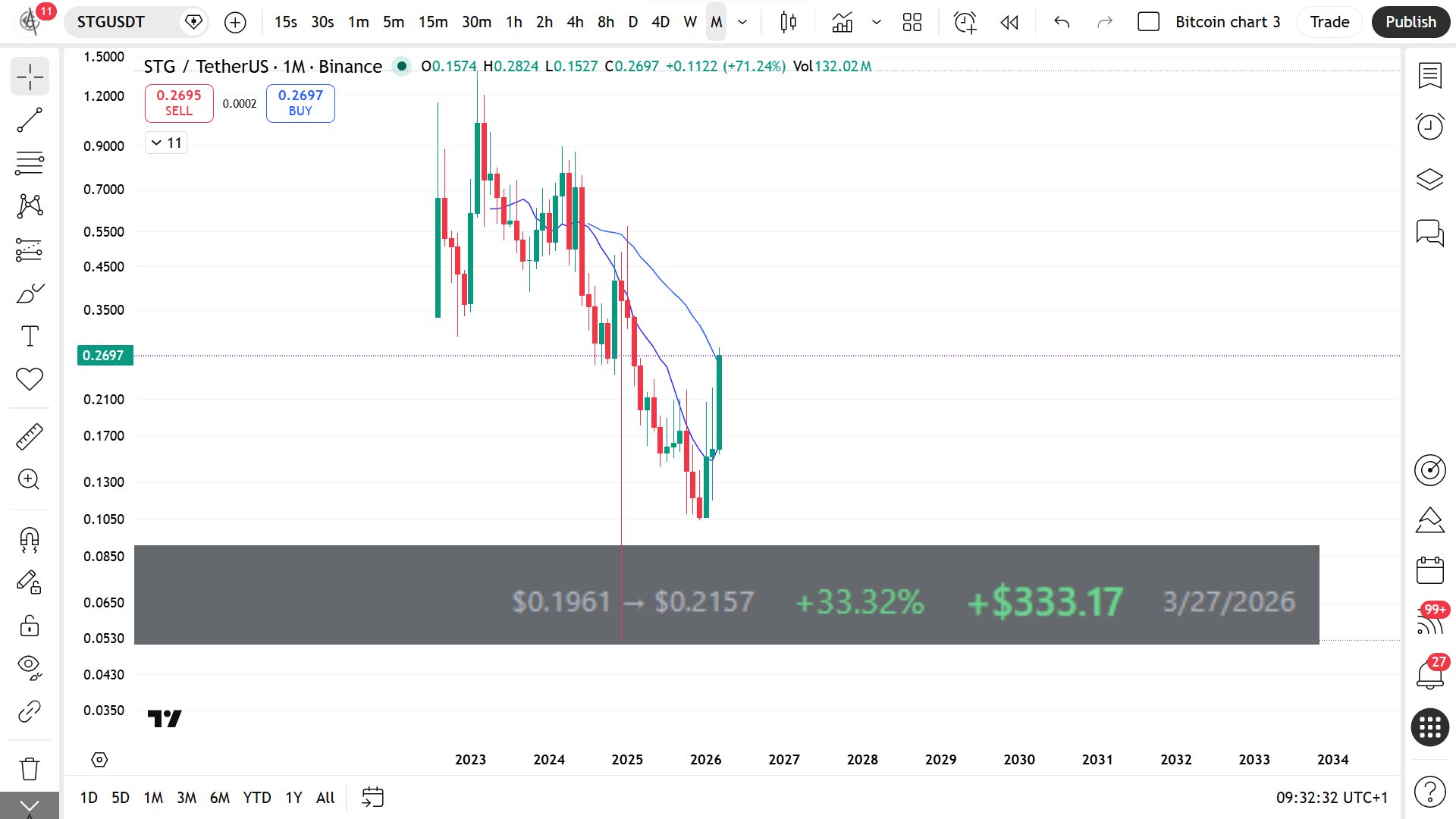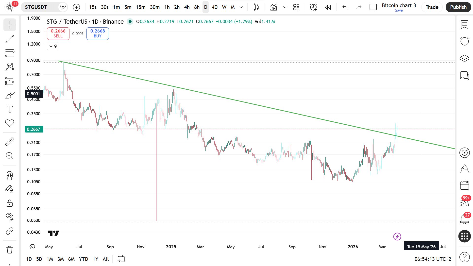 STG holds the key level, the author is bullish and has taken a long position, and the chart shows a recent uptrend.