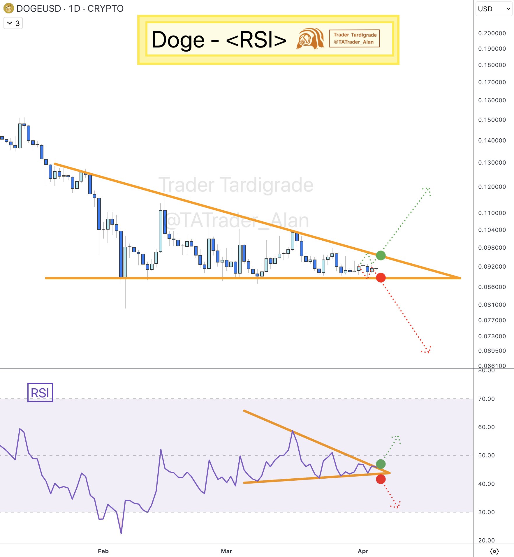 DOGE is at the end of a triangular convergence, about to experience a directional breakout, and the subsequent trend should be monitored.