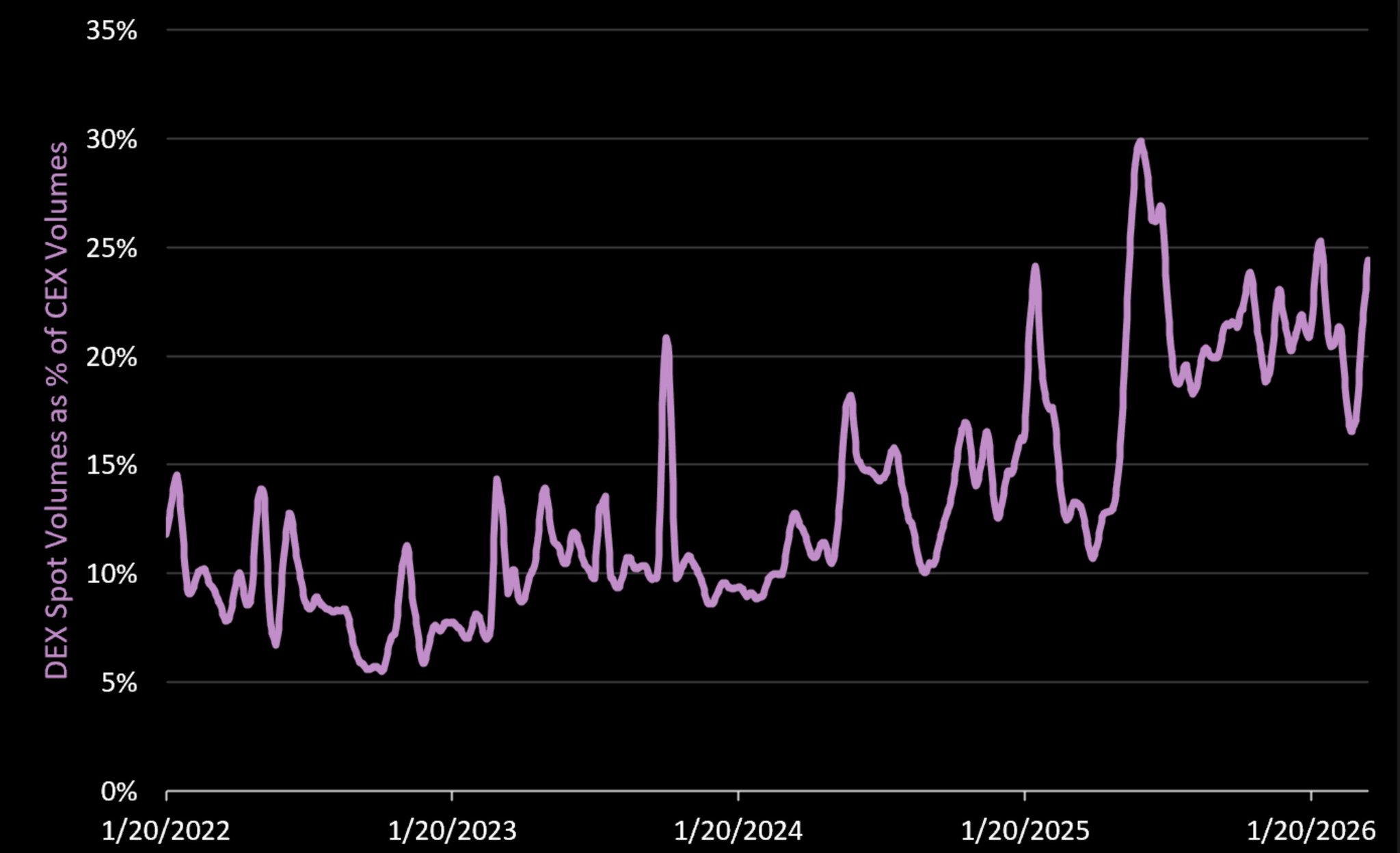 DEX volumes are now 25% of CEX volumes according to @the_defi_report.