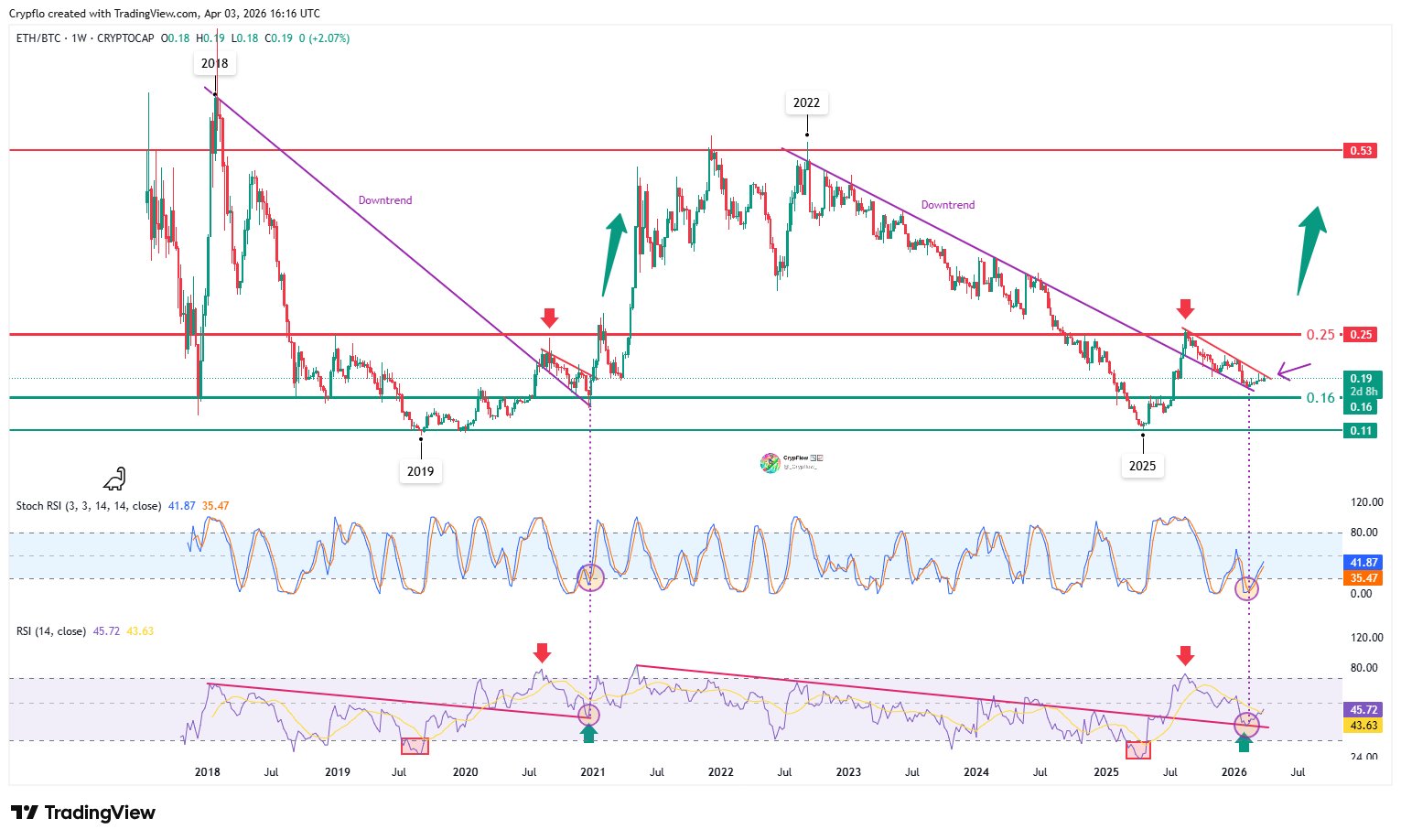 After a multi-year downtrend, ETH/BTC is once again on the verge of breaking out of the bull flag…
