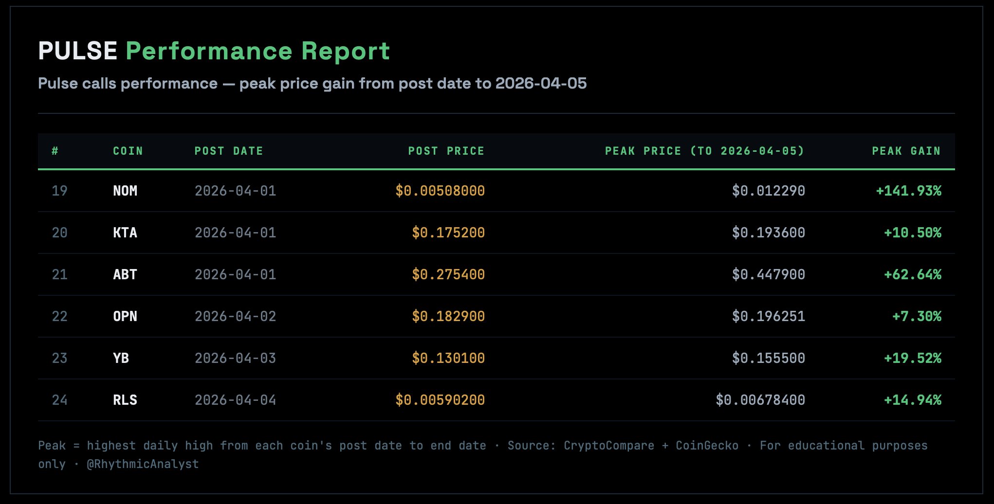 The Pulse report shows significant peak returns for multiple coins, including NOM, before April 5, 2026, reaching up to 141.93%.