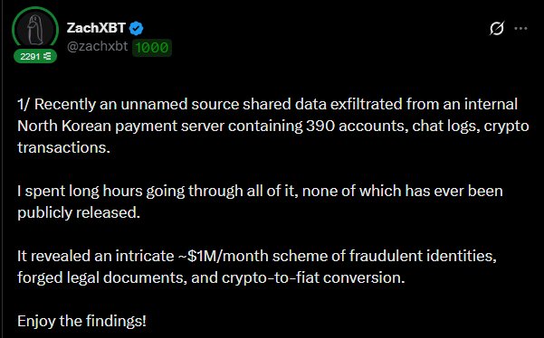 > ZachXBT publishes 390 DPRK crypto accounts from exfiltrated payment server