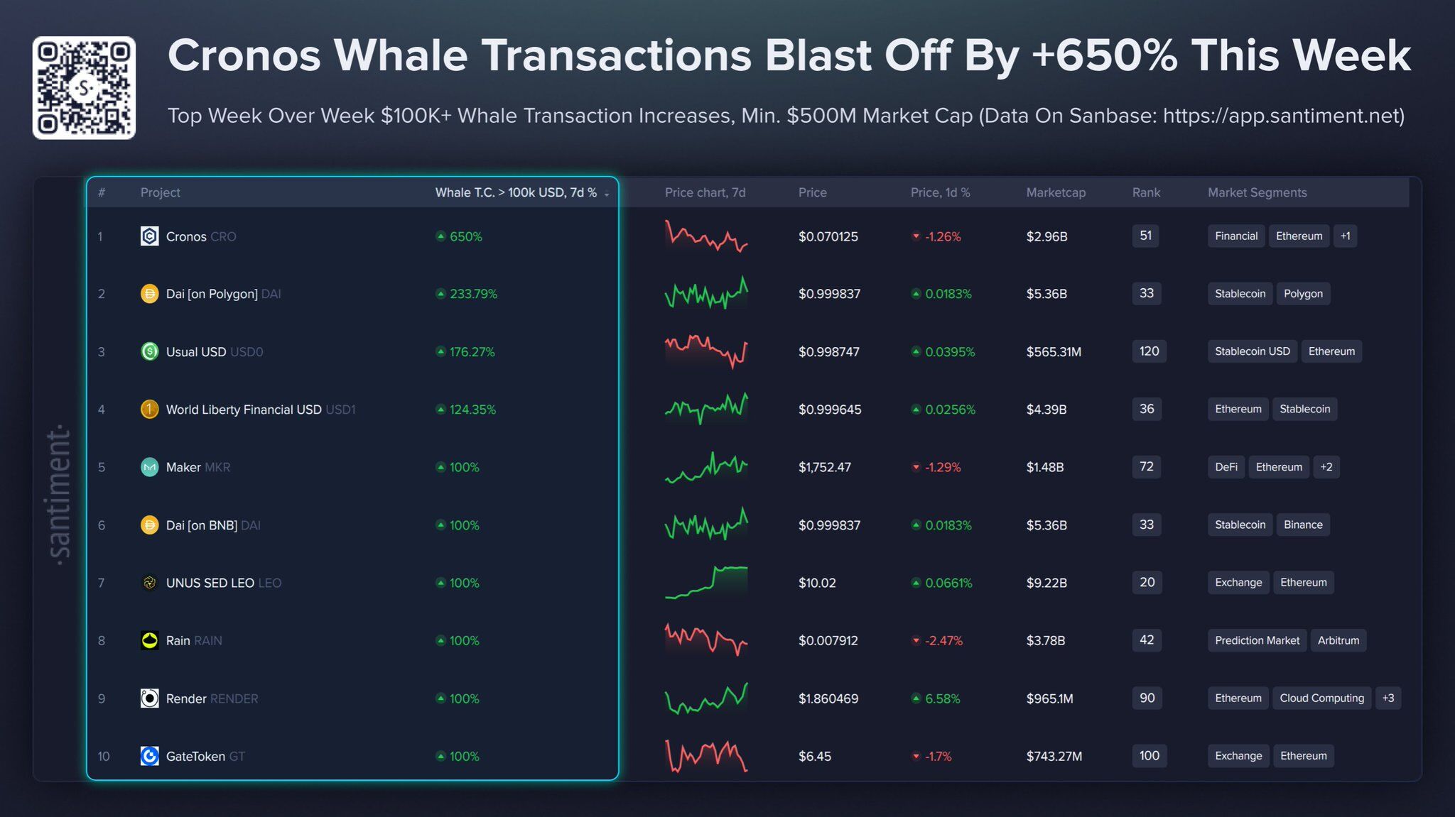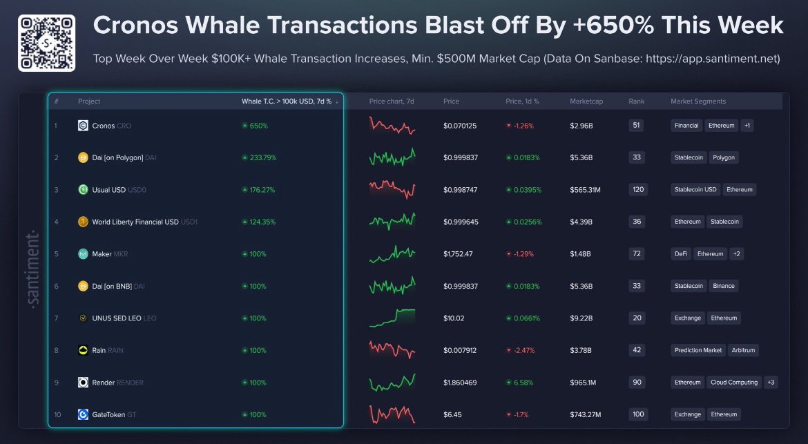 🚨 UPDATE: Cronos led weekly whale transaction growth with a +650% spike, followed by DAI, USDD, and USD1 among top large-cap assets seeing increased $100K+ activity, per Santiment. https://t.co/5OZ7BYadw6
