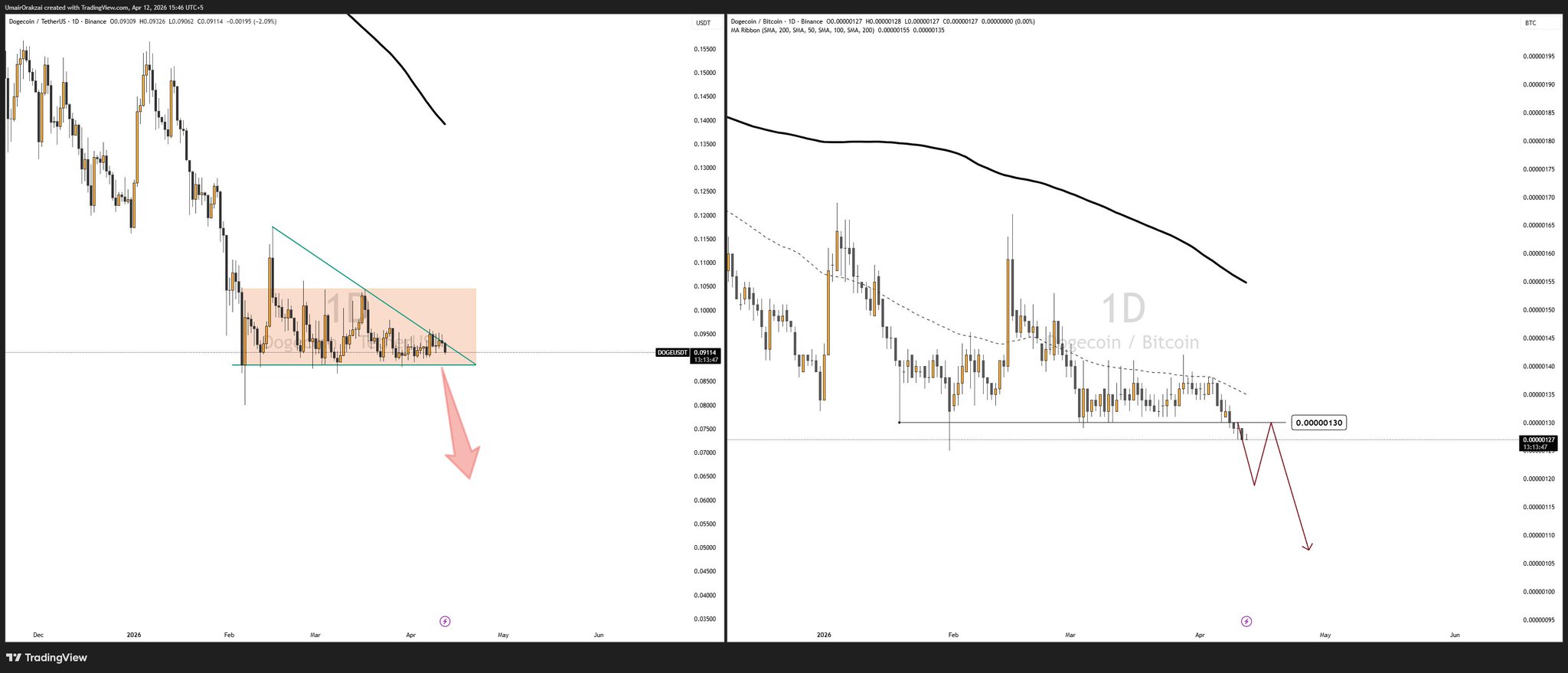 The divergence is closing. While the BTC pair led the move, the USDT liquidity sweep suggests the "fake" strength is exhausted. On-chain data shows whale inflows to exchanges are rising, and with DOGE-1 satellite delays continuing to dampen "meme" hype, the technical breakdown is the primary driver.