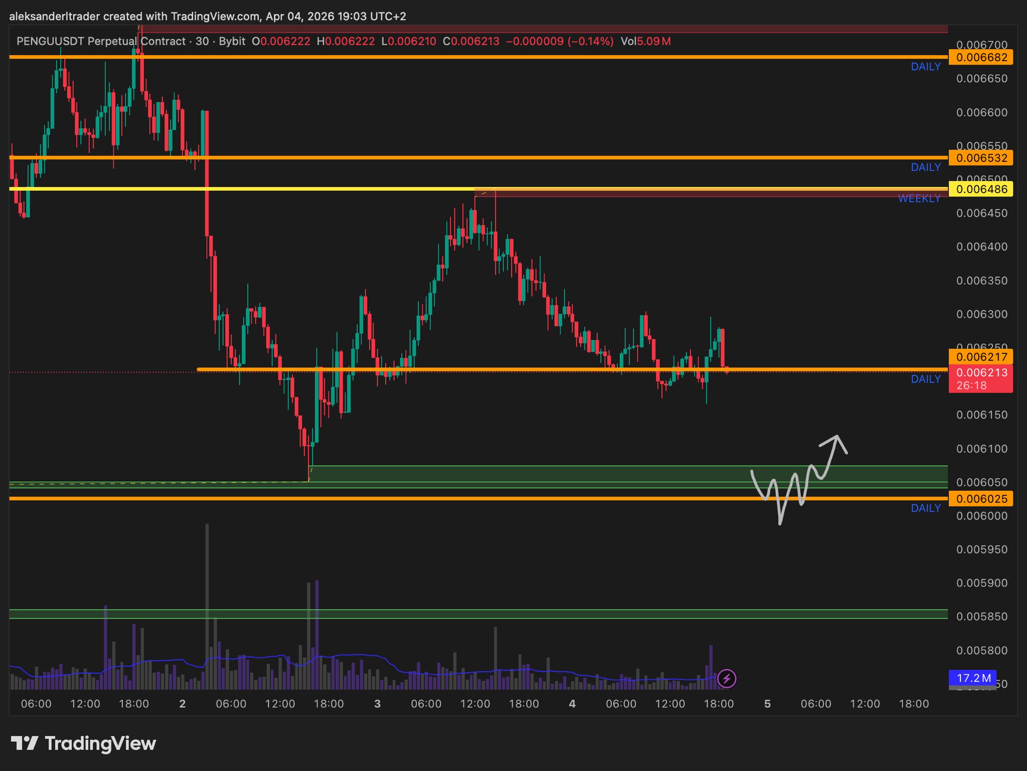 PENGU monitors a retest of the lows, seeking potential long opportunities in the 0.006075-0.006025 area.