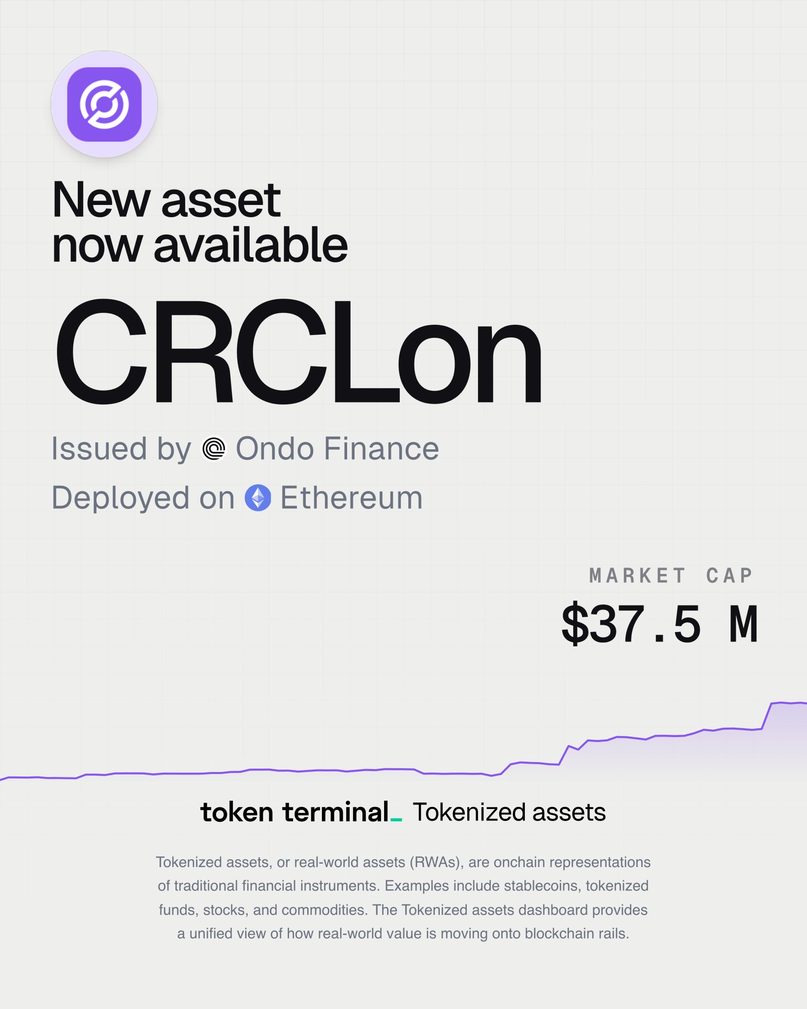 Circle's CRCLon tokenized stock launched on Ethereum, market cap up 256.1% month‑over‑month to $37.5 million.