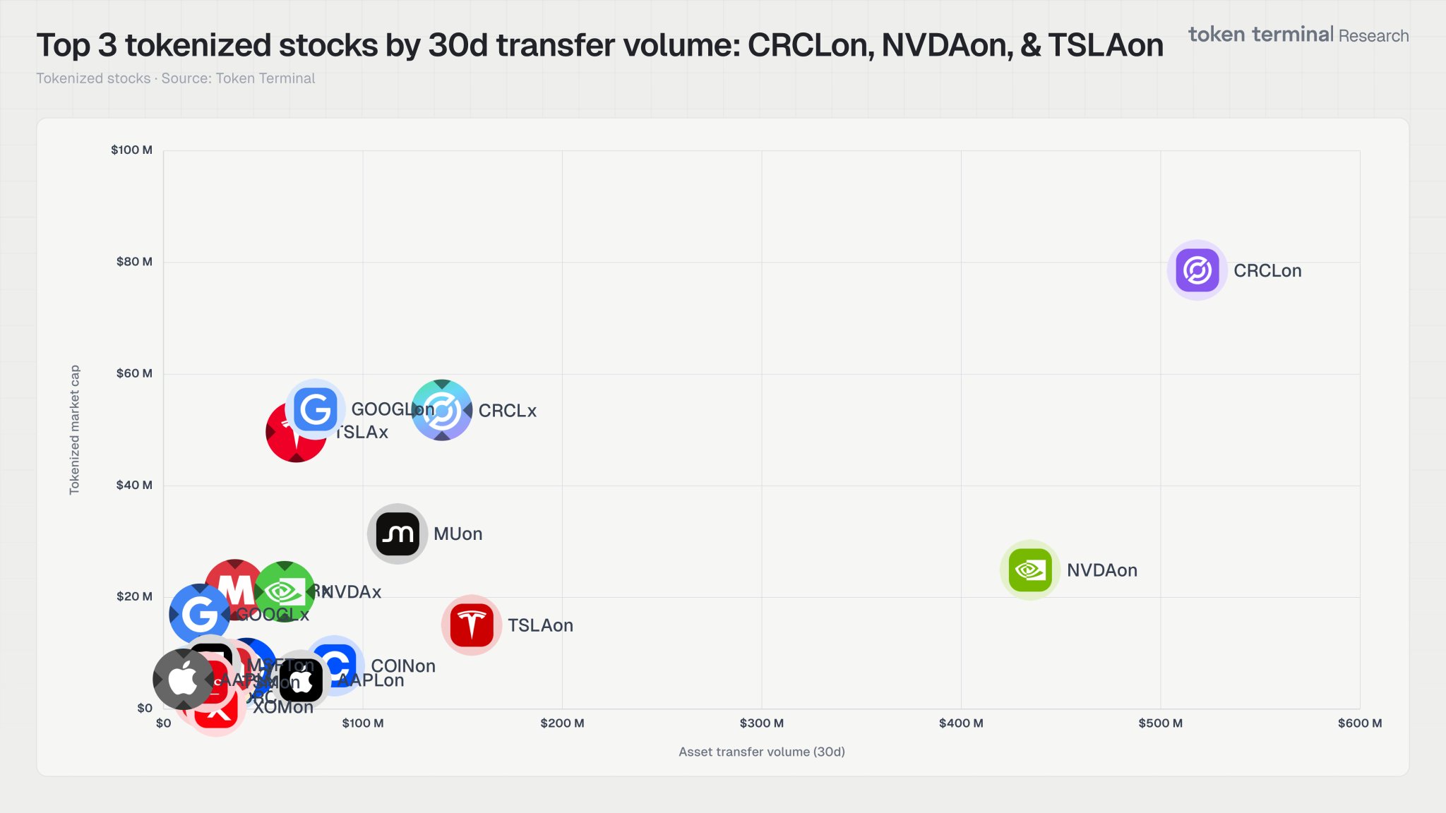 Top 3 tokenized stocks by 30d transfer volume: CRCLon, NVDAon, & TSLAon.