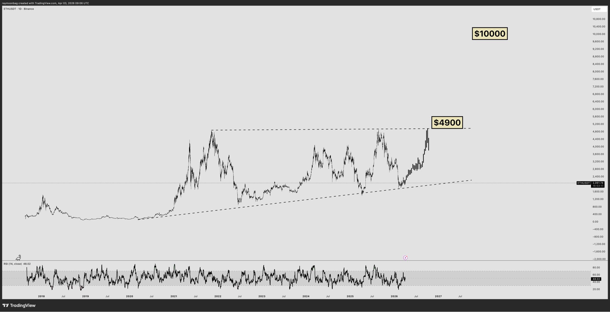 The tweet calls Ethereum the 'king', and technical charts indicate ETH is likely to break its previous high and reach $10,000.
