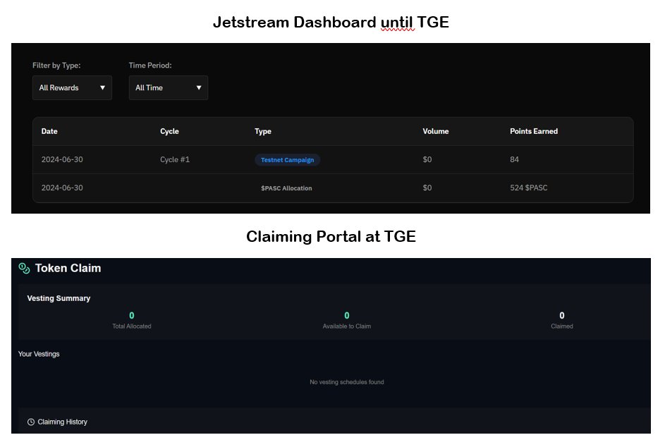 It was emphasized several times on the Discord server that all OGs would receive the 524 $PASC allocation, and without vesting. So 100% on day one. The allocation was also displayed to me in Jetstream's reward dashboard. I was finally able to access it again at the beginning of September, as the captcha loop had been fixed. So what could go wrong?