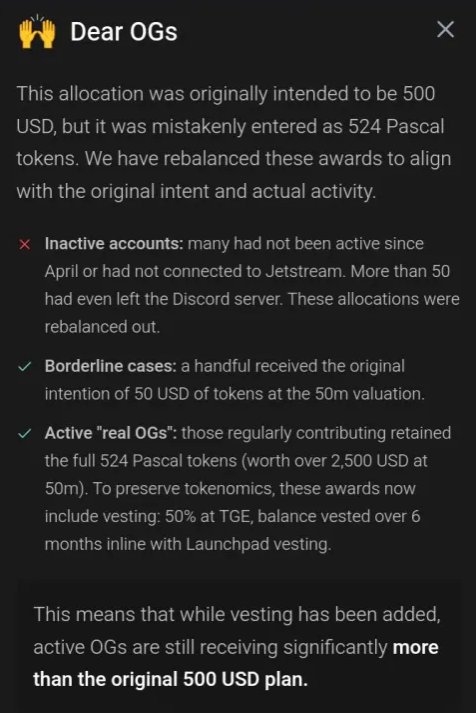 “This allocation was originally intended to be 500 USD, but it was mistakenly entered as 524 $PASC tokens. We have rebalanced these awards to align with the original intent and actual activity. Many had not been active since April or had not connected to Jetstream. More than 50 had even left the Discord server. These allocations were rebalanced out.“