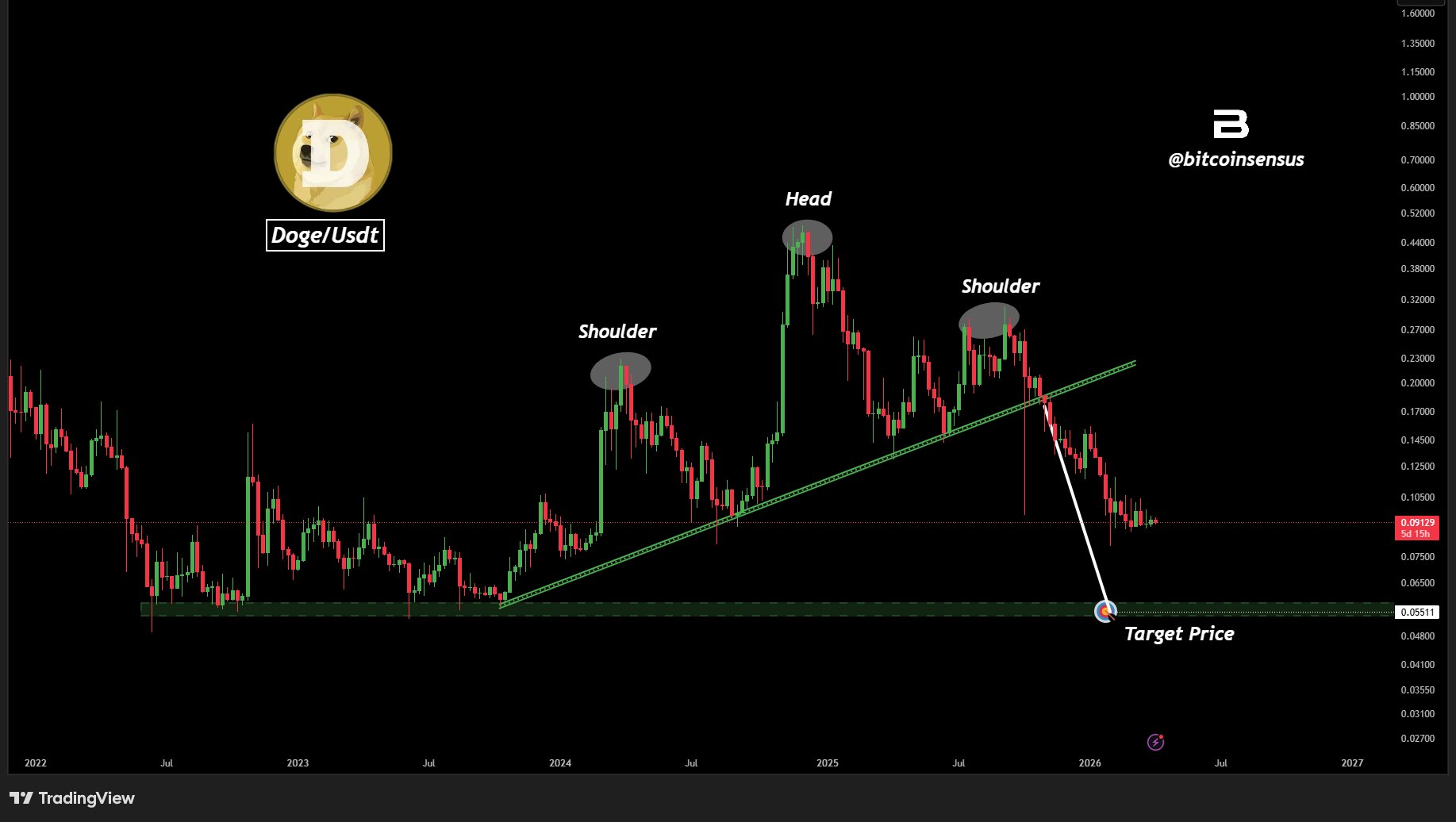 DOGE forms a head-and-shoulders top pattern and breaks support, target price around $0.055.