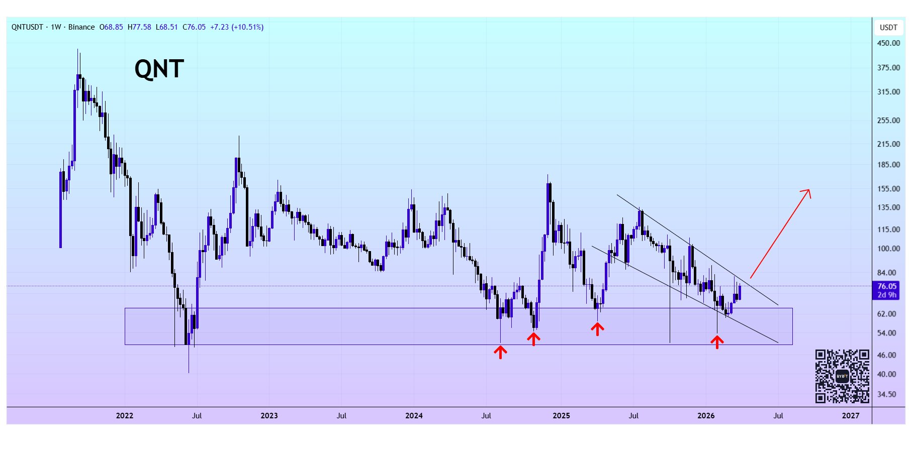 QNT is looking for a bounce off the weekly support zone, with the technical chart indicating an upward breakout.