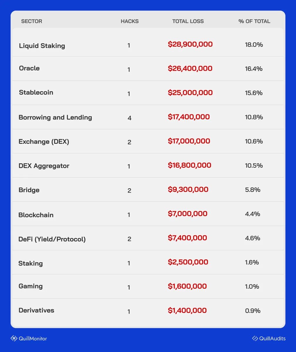 No DeFi sector was safe in Q1 2026. $160M+ gone The top 3 sectors lost $80.3M, that's 50% of all Q1 losses. Each from a single hack. One hack killed Step Finance entirely. One hack crashed Resolv stablecoin 97%. One hack drained Truebit 5-year-old contract for $26.4M. Meanwhile Borrowing & Lending got hit 4 separate times — YieldBlox, Venus, Moonwell, Aave.