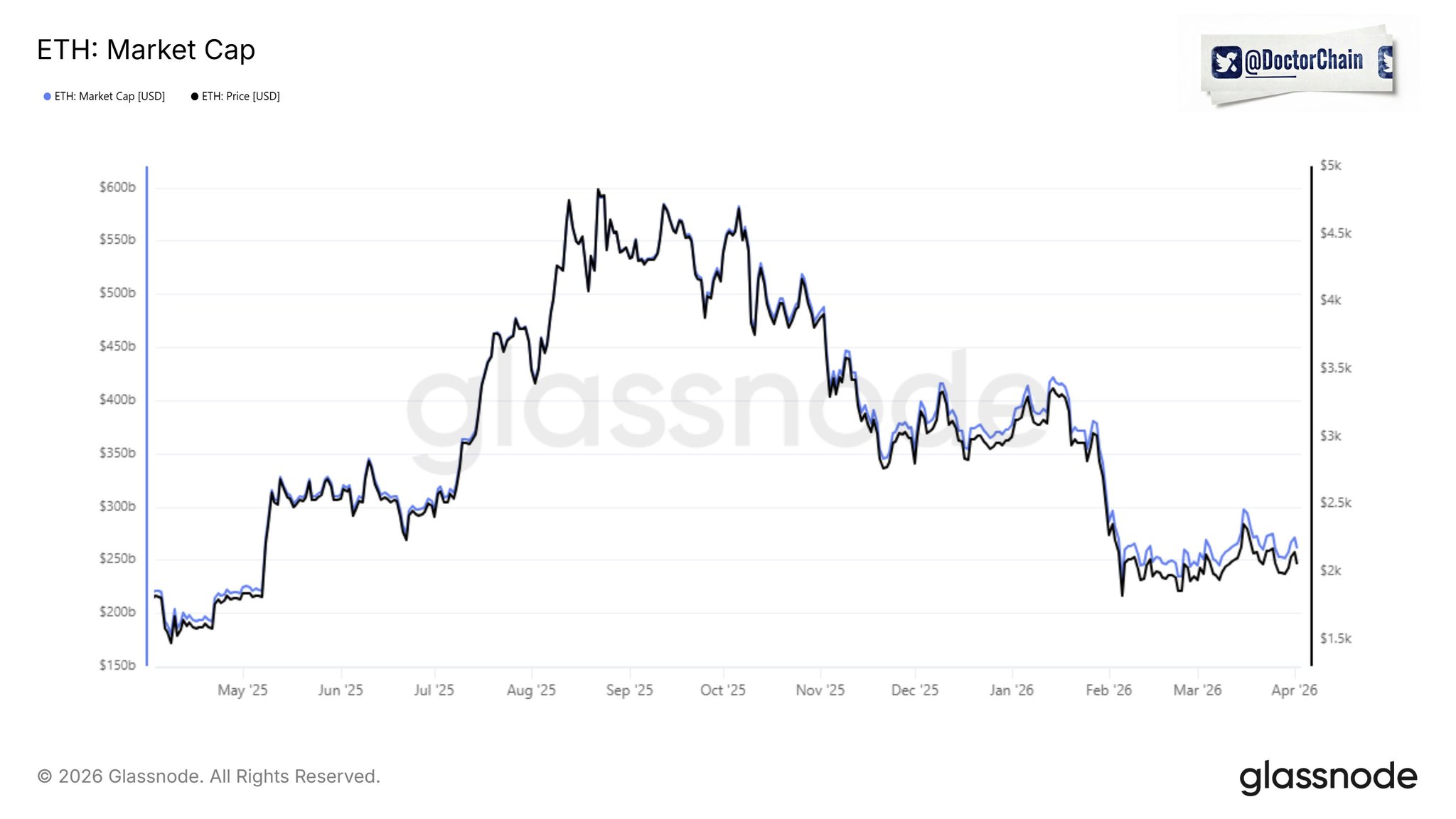On-chain, the story is even more compelling than the price chart suggests. Native ETH locked in active DeFi protocols has nearly tripled from the 2022 lows even as the dollar price fell ~60%.