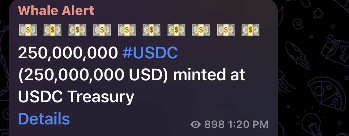Stable Coin Mint: 18 min ago another $250m $USDC issued on @solana