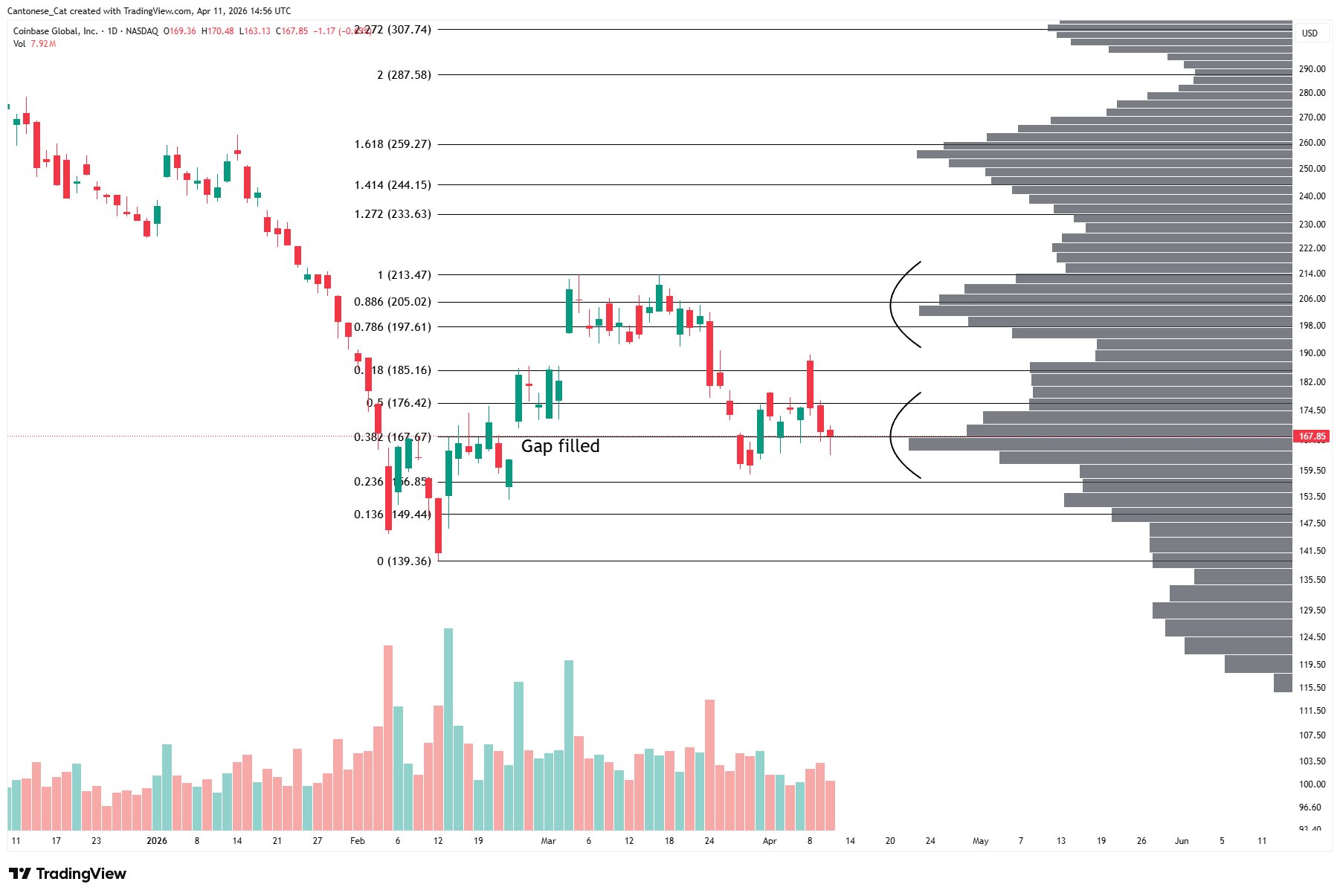 $COIN has filled the gap and may have bottomed, consolidating, awaiting the next move.