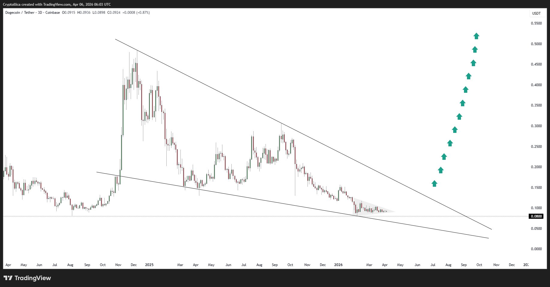 DOGE has been respecting a broad logarithmic uptrend channel since 2023, with prior impulses of roughly +290% and +440% from the lower band toward the upper boundary.