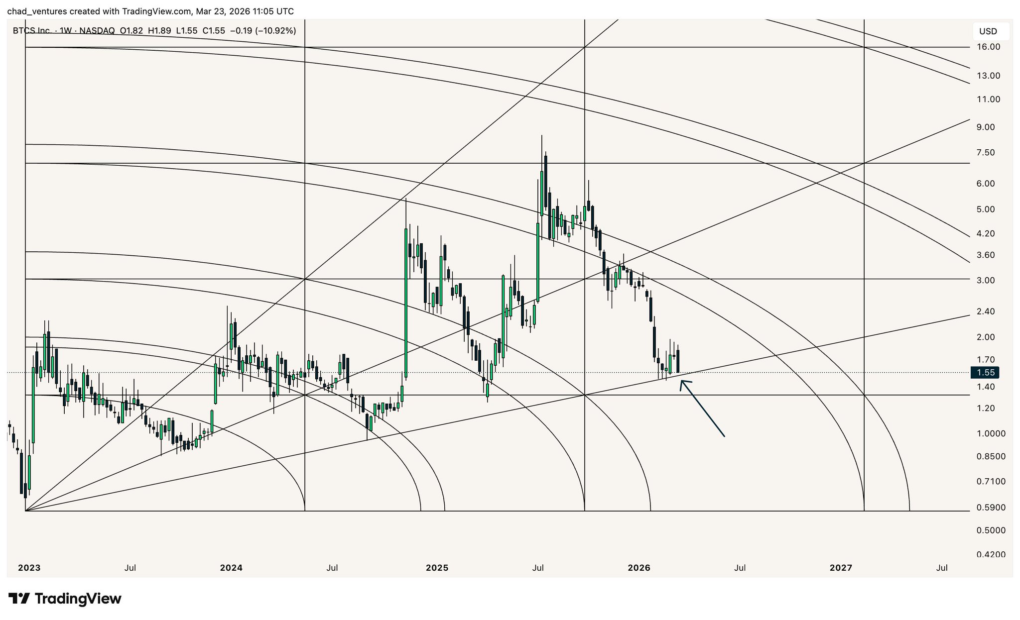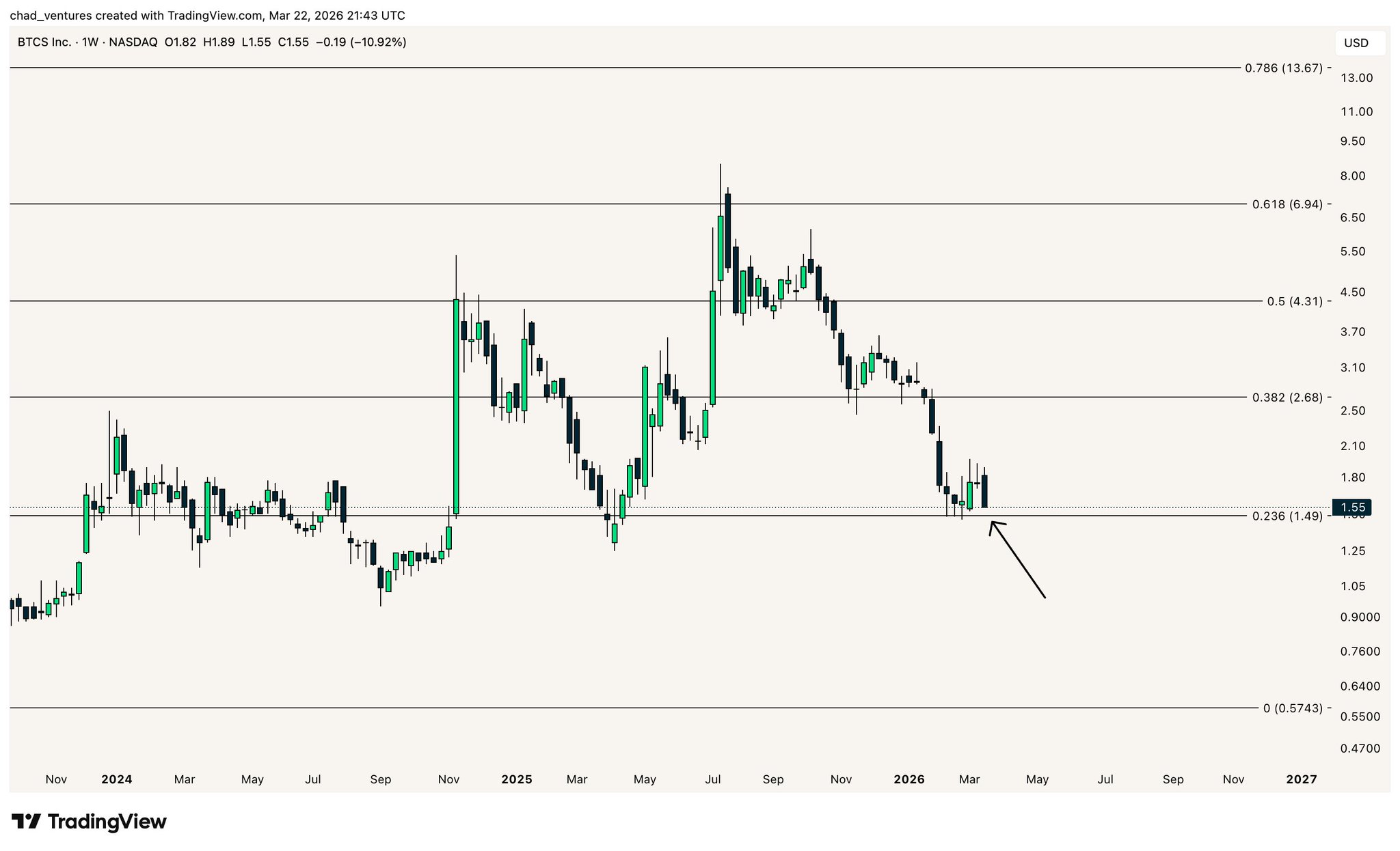 BTCS is nearing the 0.236 logarithmic Fibonacci support level, which could provide price support.