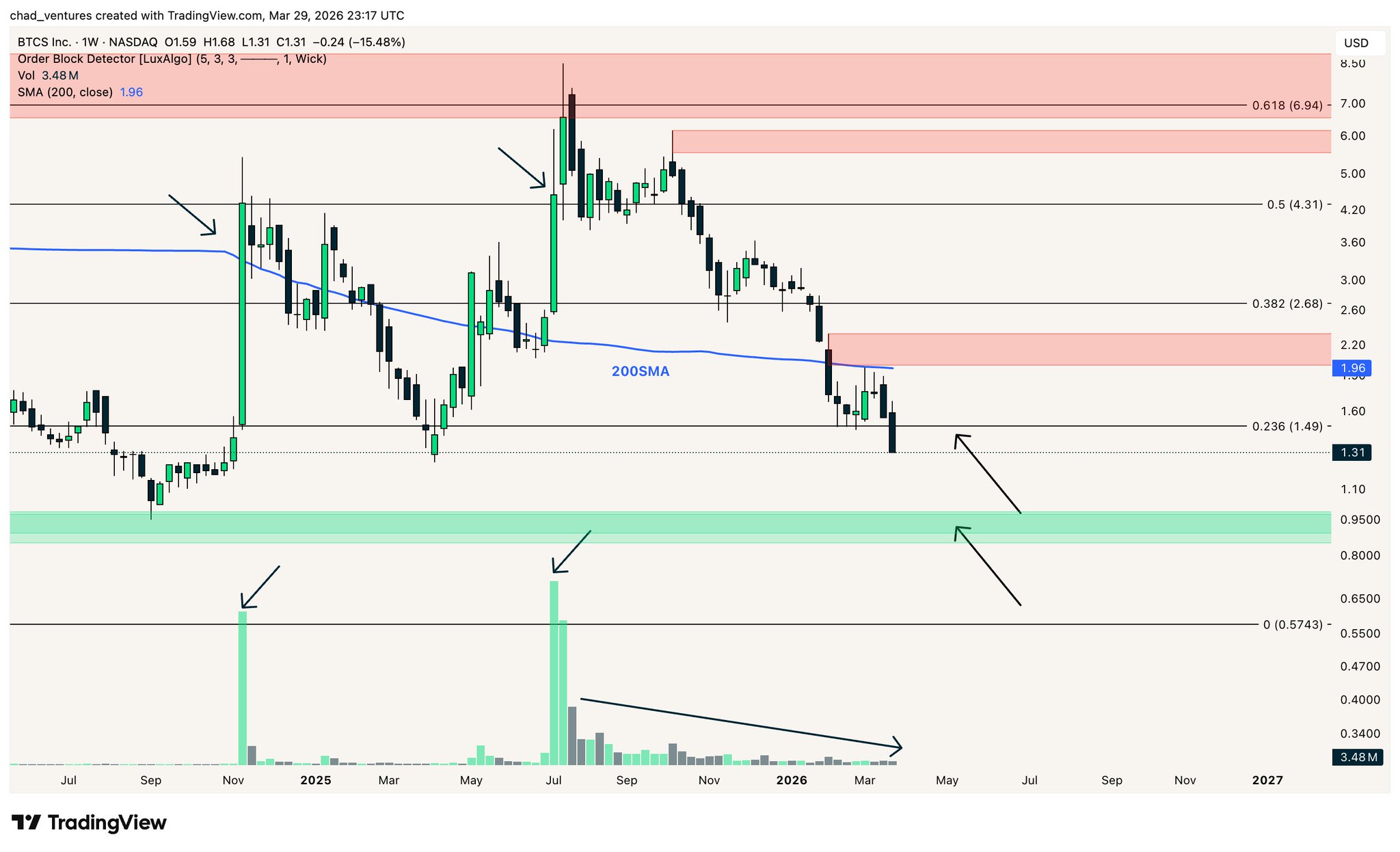 BTCS broke below key support and moving averages, expected to further decline toward around $0.97.