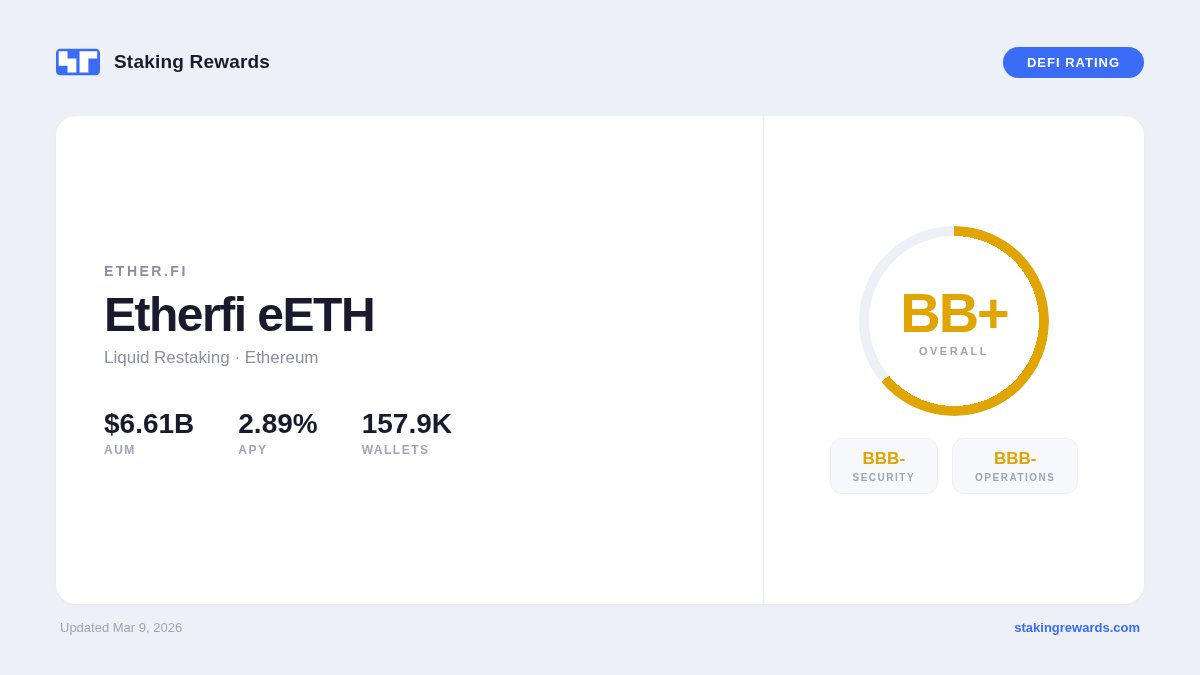 StakingRewards updates eETH rating to BB+ and outlines pros and cons.