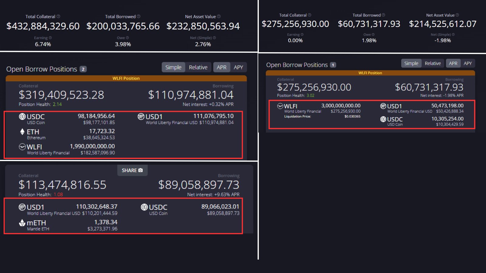 > 0x44a...5fad deposited 3b wlfi and borrowed $50m usd1 + $10m usdc, paying 1.35% apr on the borrowed funds