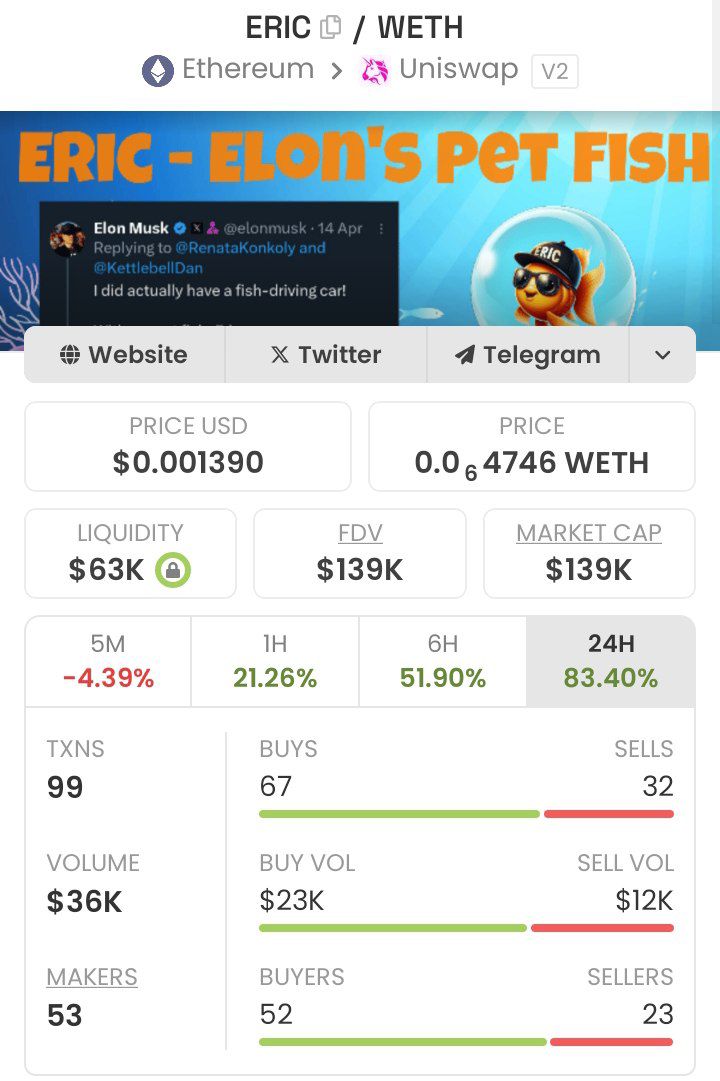 Elon's Pet Fish ERICの今日、7日間、30日間、90日間の価格を追跡