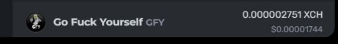 go fu*k yourself. (GFY) is a cryptocurrency launched in 2023and operates on the Ethereum platform. go fu*k yourself. has a current supply of 682,021,347,140 with 0 in circulation. The last known price of go fu*k yourself. is 0.00000006 USD and is up 0.00 over the last 24 hours. More information can be found at https://www.gofuckyourselfcoin.com/.