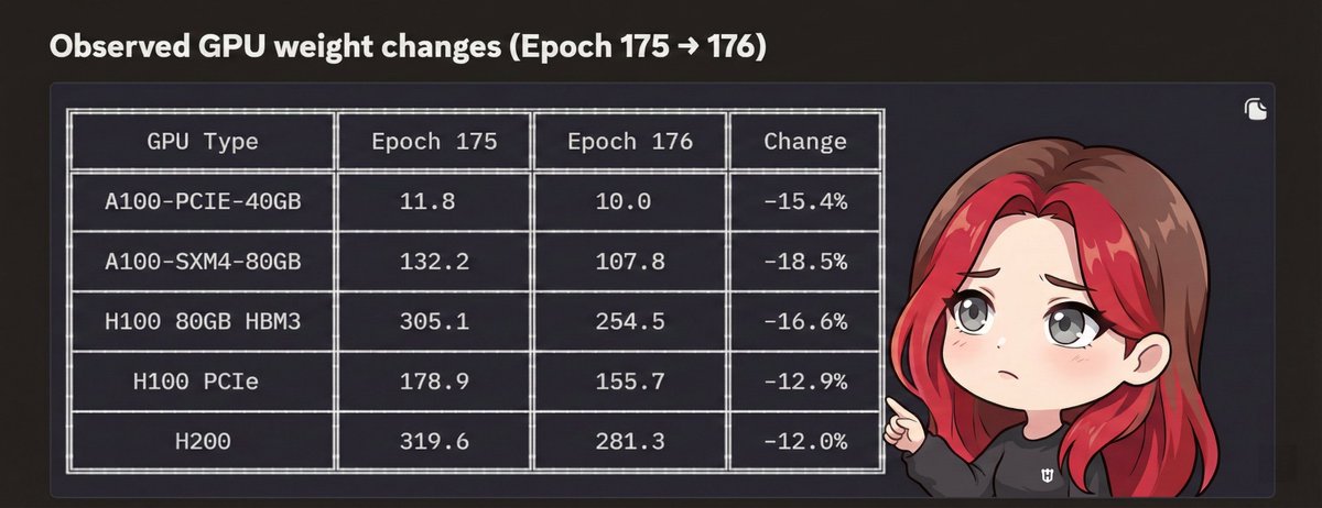 They just implemented real-time PoC weight normalization. Look at the attached table - A100s and H100s just saw their weights drop by 12-18% overnight because the effective reference window got longer