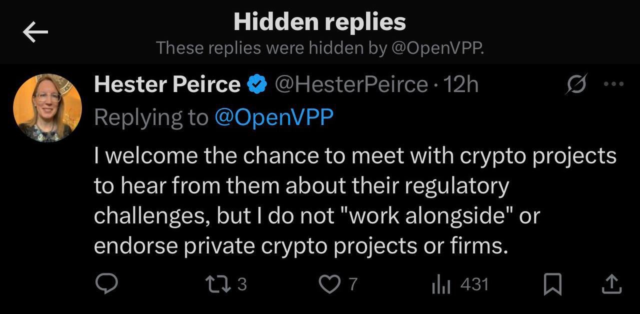 12 hrs ago Hester Pierce replied saying she does not work alongside or endorse private crypto projects.