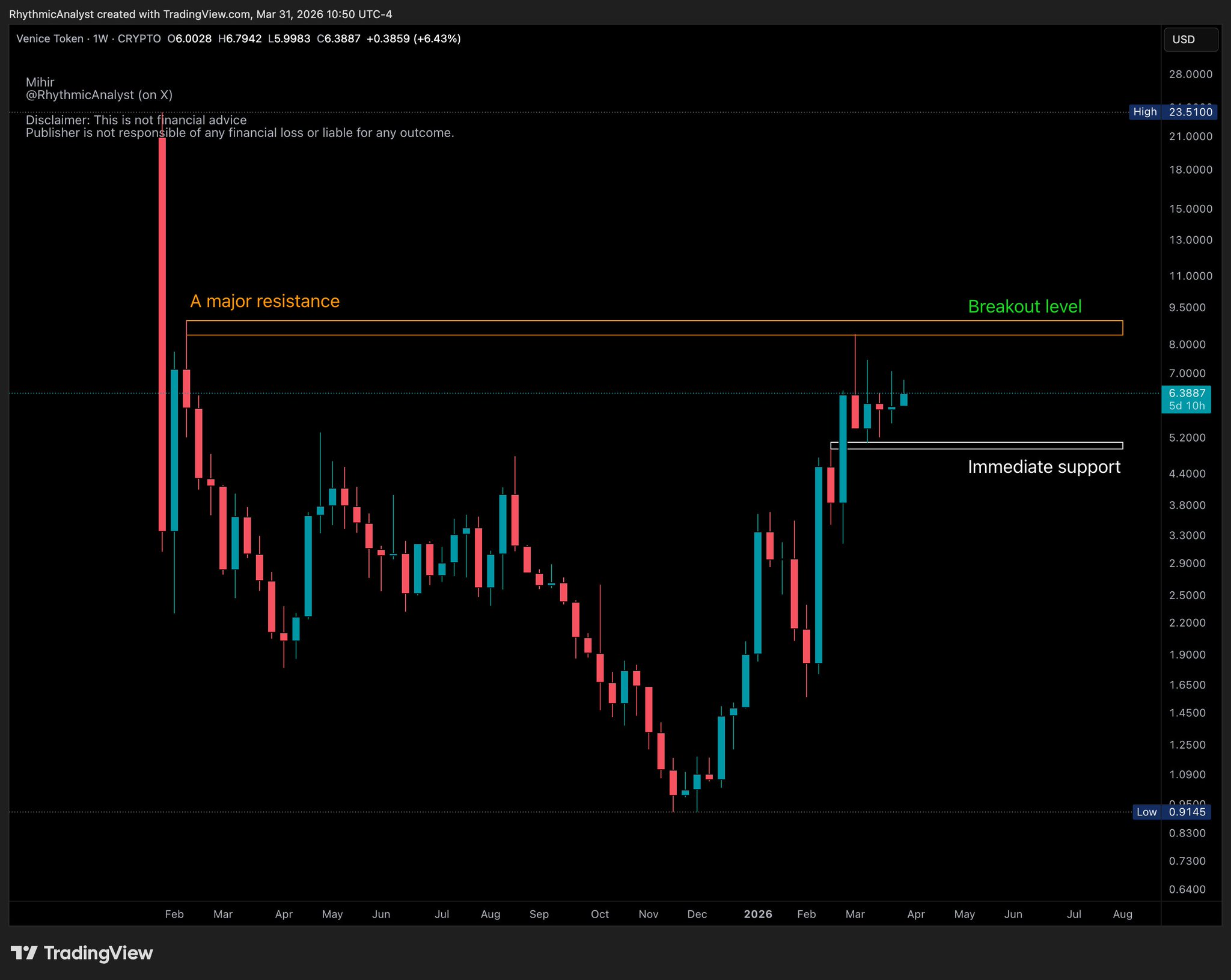 VVV breakout, but the author warns that recent similar breakouts often fail and retrace, suggesting caution regarding risk.