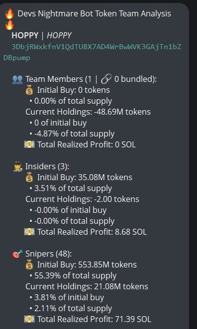 $HOPPY (CA 3DbjRWxkfnV1QdTU8X7AD4WrBwWVK3GAjTn1bZDBpump) doesn't have insiders, snipers have 2.1% per devsnightmare. khuun16, IncCoolSwallow, 0xclanker ".vibe" are top holders.