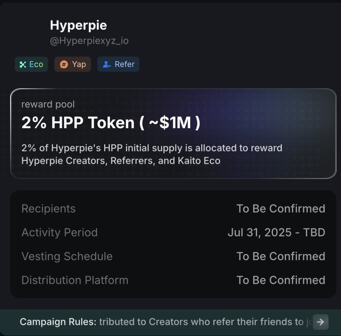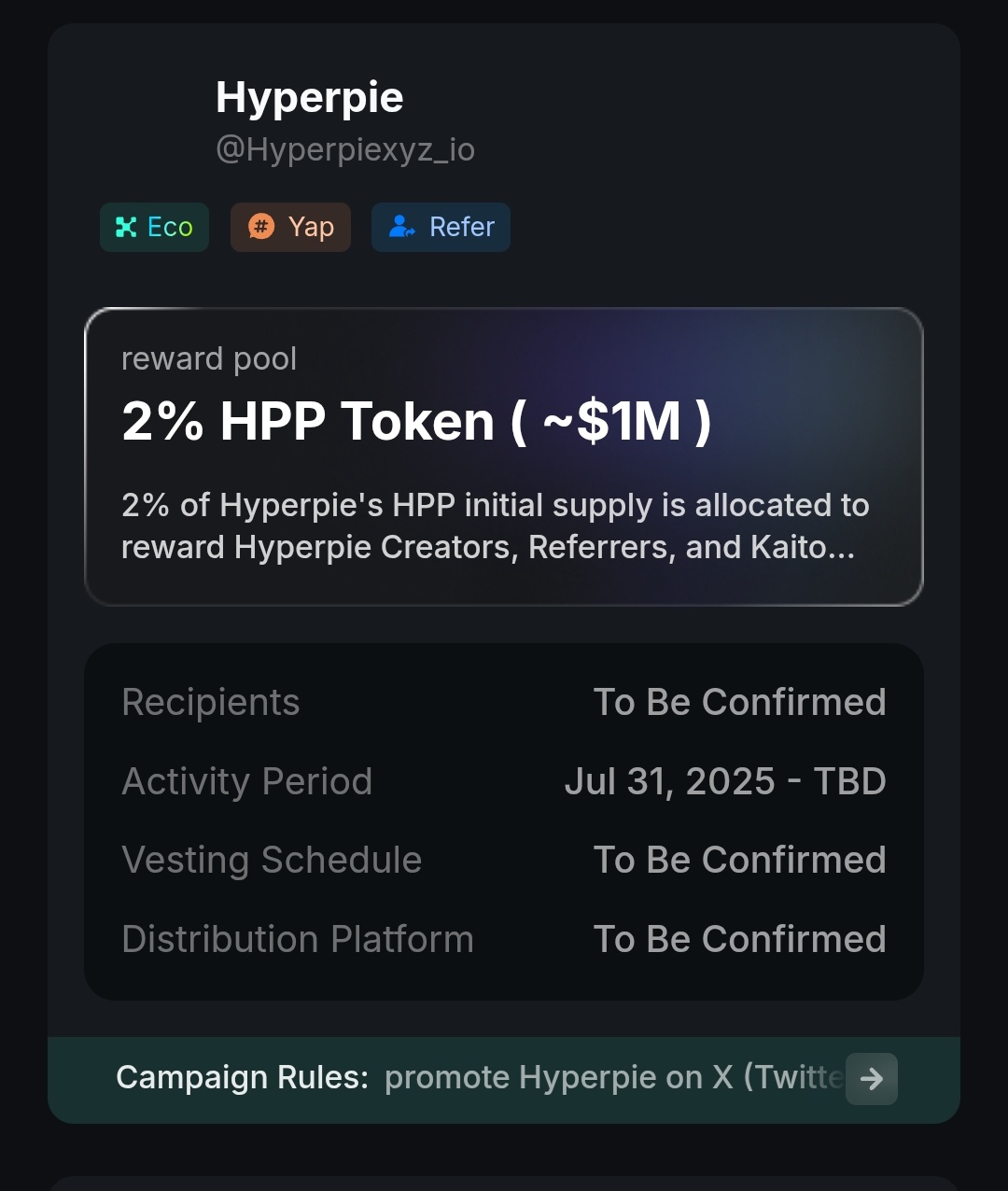 The user asks KaitoAI for clarification on the status of the 2% HPP token reward pool after the Hyperpie project rebranded to SpinUpZone.