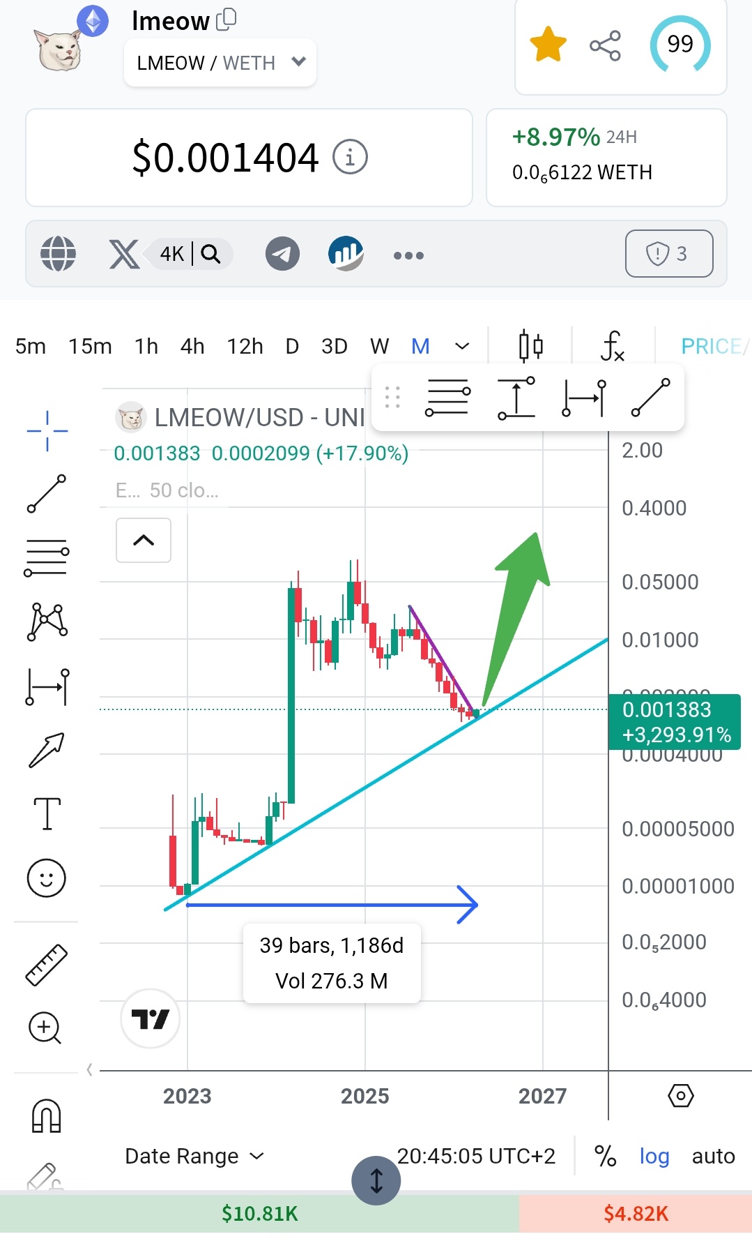 LMEOW is at a 3‑year support level and is about to break a downtrend, with a large rise expected in the next cycle.