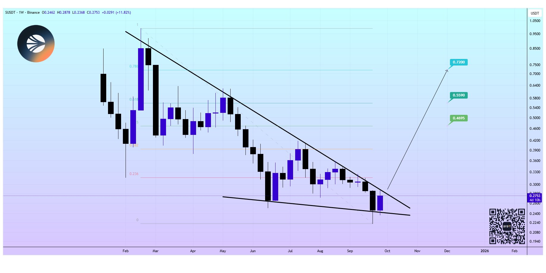 Sonic coin completed a falling wedge on the weekly chart. The author believes it has bottomed out and provides bullish target prices of $0.4695, $0.5590, and $0.7200.