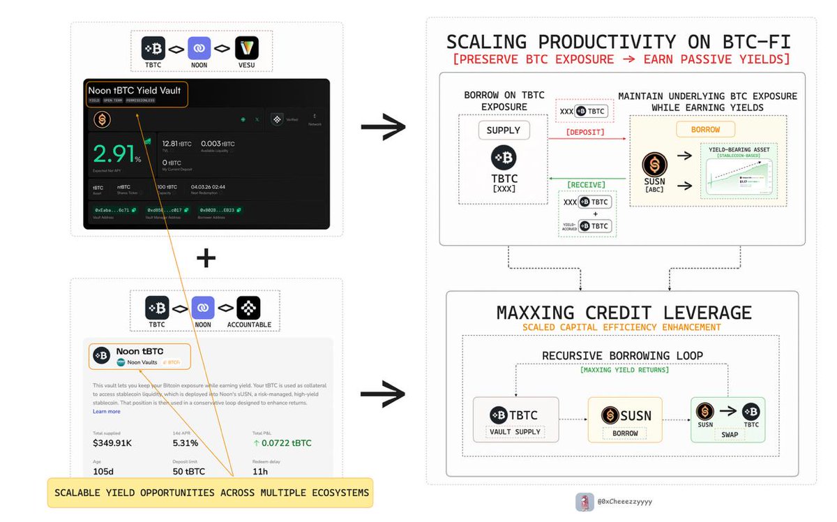 🔸Yield sourced via tBTC → USDC → sUSN, looped through Vesu